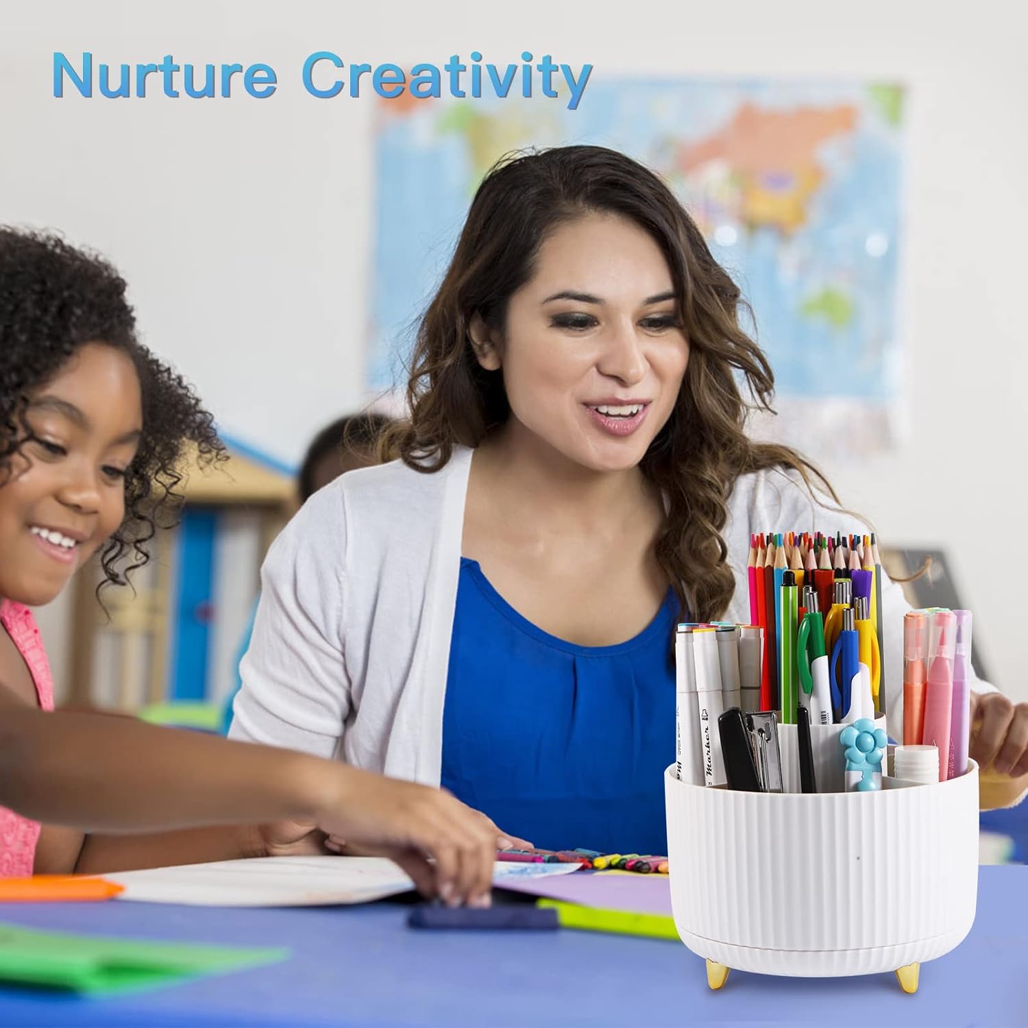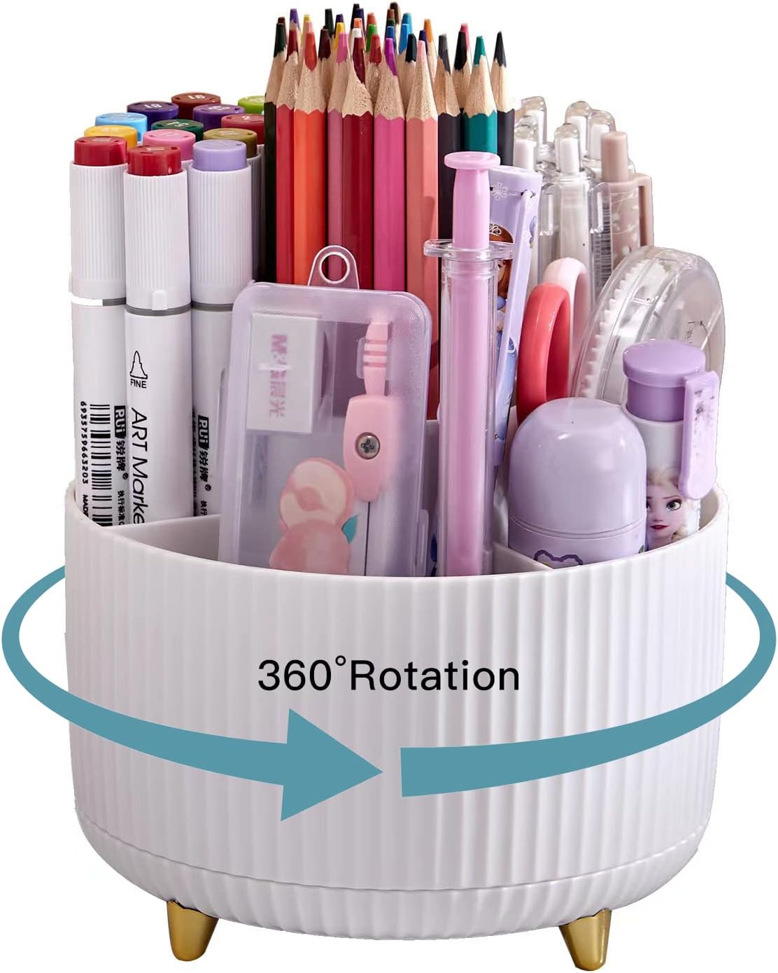 Porta-canetas para mesa, porta-lápis, 5 compartimentos, organizadores de mesa giratórios de 360° e acessórios, porta-canetas fofo para escritório, escola, casa, material de arte (branco)