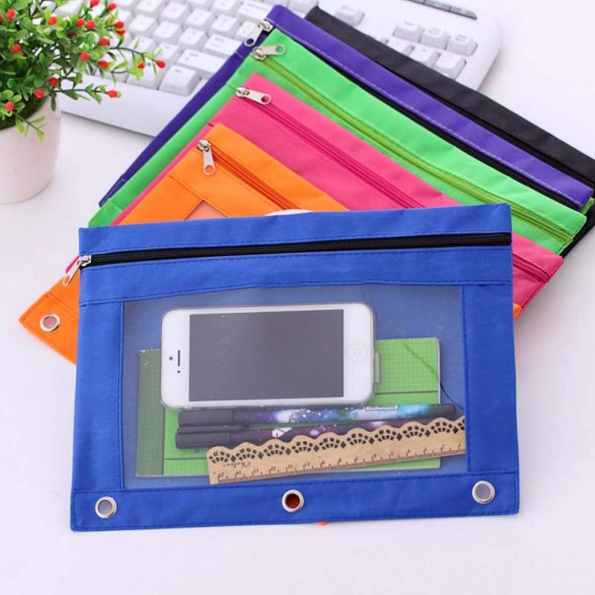 Estojo para lápis com 3 argolas, estojo para lápis com zíper, pasta para cosméticos, preto, pacote com 2 unidades